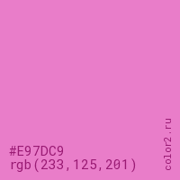 Цвет #E97DC9 в цветовой модели RGB обозначается тремя октетами (233, 125, 201) в десятичном формате и #E97DC9 в шестнадцатиричном (hex) формате, которые являются интенсивностью красного 233 (hex E9), интенсивность зелёного 125 (hex 7D) и интенсивность синего 201 (hex C9).