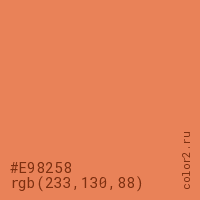 Цвет #E98258 в цветовой модели RGB обозначается тремя октетами (233, 130, 88) в десятичном формате и #E98258 в шестнадцатиричном (hex) формате, которые являются интенсивностью красного 233 (hex E9), интенсивность зелёного 130 (hex 82) и интенсивность синего 88 (hex 58).