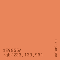 Цвет #E9855A в цветовой модели RGB обозначается тремя октетами (233, 133, 90) в десятичном формате и #E9855A в шестнадцатиричном (hex) формате, которые являются интенсивностью красного 233 (hex E9), интенсивность зелёного 133 (hex 85) и интенсивность синего 90 (hex 5A).