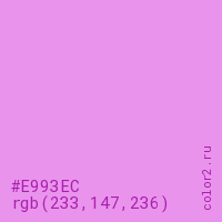 Цвет #E993EC в цветовой модели RGB обозначается тремя октетами (233, 147, 236) в десятичном формате и #E993EC в шестнадцатиричном (hex) формате, которые являются интенсивностью красного 233 (hex E9), интенсивность зелёного 147 (hex 93) и интенсивность синего 236 (hex EC).