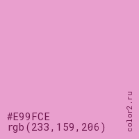 Цвет #E99FCE в цветовой модели RGB обозначается тремя октетами (233, 159, 206) в десятичном формате и #E99FCE в шестнадцатиричном (hex) формате, которые являются интенсивностью красного 233 (hex E9), интенсивность зелёного 159 (hex 9F) и интенсивность синего 206 (hex CE).