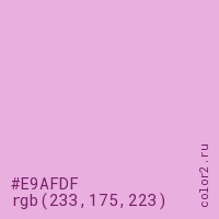Цвет #E9AFDF в цветовой модели RGB обозначается тремя октетами (233, 175, 223) в десятичном формате и #E9AFDF в шестнадцатиричном (hex) формате, которые являются интенсивностью красного 233 (hex E9), интенсивность зелёного 175 (hex AF) и интенсивность синего 223 (hex DF).