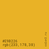 Цвет #E9B226 в цветовой модели RGB обозначается тремя октетами (233, 178, 38) в десятичном формате и #E9B226 в шестнадцатиричном (hex) формате, которые являются интенсивностью красного 233 (hex E9), интенсивность зелёного 178 (hex B2) и интенсивность синего 38 (hex 26).