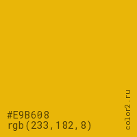 Цвет #E9B608 в цветовой модели RGB обозначается тремя октетами (233, 182, 8) в десятичном формате и #E9B608 в шестнадцатиричном (hex) формате, которые являются интенсивностью красного 233 (hex E9), интенсивность зелёного 182 (hex B6) и интенсивность синего 8 (hex 08).