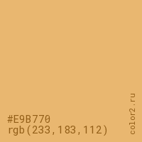 Цвет #E9B770 в цветовой модели RGB обозначается тремя октетами (233, 183, 112) в десятичном формате и #E9B770 в шестнадцатиричном (hex) формате, которые являются интенсивностью красного 233 (hex E9), интенсивность зелёного 183 (hex B7) и интенсивность синего 112 (hex 70).