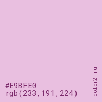 Цвет #E9BFE0 в цветовой модели RGB обозначается тремя октетами (233, 191, 224) в десятичном формате и #E9BFE0 в шестнадцатиричном (hex) формате, которые являются интенсивностью красного 233 (hex E9), интенсивность зелёного 191 (hex BF) и интенсивность синего 224 (hex E0).