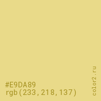 Цвет #E9DA89 в цветовой модели RGB обозначается тремя октетами (233, 218, 137) в десятичном формате и #E9DA89 в шестнадцатиричном (hex) формате, которые являются интенсивностью красного 233 (hex E9), интенсивность зелёного 218 (hex DA) и интенсивность синего 137 (hex 89).