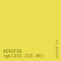 Цвет #E9DF50 в цветовой модели RGB обозначается тремя октетами (233, 223, 80) в десятичном формате и #E9DF50 в шестнадцатиричном (hex) формате, которые являются интенсивностью красного 233 (hex E9), интенсивность зелёного 223 (hex DF) и интенсивность синего 80 (hex 50).