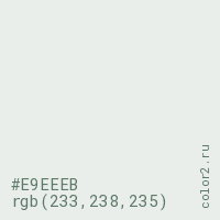 Цвет #E9EEEB в цветовой модели RGB обозначается тремя октетами (233, 238, 235) в десятичном формате и #E9EEEB в шестнадцатиричном (hex) формате, которые являются интенсивностью красного 233 (hex E9), интенсивность зелёного 238 (hex EE) и интенсивность синего 235 (hex EB).