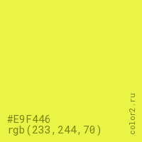 Цвет #E9F446 в цветовой модели RGB обозначается тремя октетами (233, 244, 70) в десятичном формате и #E9F446 в шестнадцатиричном (hex) формате, которые являются интенсивностью красного 233 (hex E9), интенсивность зелёного 244 (hex F4) и интенсивность синего 70 (hex 46).