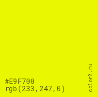 Цвет #E9F700 в цветовой модели RGB обозначается тремя октетами (233, 247, 0) в десятичном формате и #E9F700 в шестнадцатиричном (hex) формате, которые являются интенсивностью красного 233 (hex E9), интенсивность зелёного 247 (hex F7) и интенсивность синего 0 (hex 00).