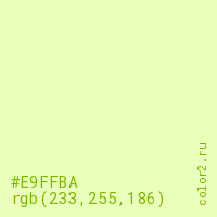 Цвет #E9FFBA в цветовой модели RGB обозначается тремя октетами (233, 255, 186) в десятичном формате и #E9FFBA в шестнадцатиричном (hex) формате, которые являются интенсивностью красного 233 (hex E9), интенсивность зелёного 255 (hex FF) и интенсивность синего 186 (hex BA).