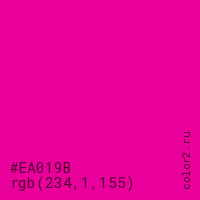 Цвет #EA019B в цветовой модели RGB обозначается тремя октетами (234, 1, 155) в десятичном формате и #EA019B в шестнадцатиричном (hex) формате, которые являются интенсивностью красного 234 (hex EA), интенсивность зелёного 1 (hex 01) и интенсивность синего 155 (hex 9B).