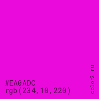 Цвет #EA0ADC в цветовой модели RGB обозначается тремя октетами (234, 10, 220) в десятичном формате и #EA0ADC в шестнадцатиричном (hex) формате, которые являются интенсивностью красного 234 (hex EA), интенсивность зелёного 10 (hex 0A) и интенсивность синего 220 (hex DC).