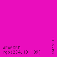 Цвет #EA0DBD в цветовой модели RGB обозначается тремя октетами (234, 13, 189) в десятичном формате и #EA0DBD в шестнадцатиричном (hex) формате, которые являются интенсивностью красного 234 (hex EA), интенсивность зелёного 13 (hex 0D) и интенсивность синего 189 (hex BD).