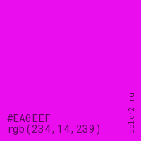 Цвет #EA0EEF в цветовой модели RGB обозначается тремя октетами (234, 14, 239) в десятичном формате и #EA0EEF в шестнадцатиричном (hex) формате, которые являются интенсивностью красного 234 (hex EA), интенсивность зелёного 14 (hex 0E) и интенсивность синего 239 (hex EF).