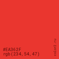 Цвет #EA362F в цветовой модели RGB обозначается тремя октетами (234, 54, 47) в десятичном формате и #EA362F в шестнадцатиричном (hex) формате, которые являются интенсивностью красного 234 (hex EA), интенсивность зелёного 54 (hex 36) и интенсивность синего 47 (hex 2F).