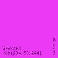 Цвет #EA3AF4 в цветовой модели RGB обозначается тремя октетами (234, 58, 244) в десятичном формате и #EA3AF4 в шестнадцатиричном (hex) формате, которые являются интенсивностью красного 234 (hex EA), интенсивность зелёного 58 (hex 3A) и интенсивность синего 244 (hex F4).