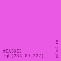 Цвет #EA59E3 в цветовой модели RGB обозначается тремя октетами (234, 89, 227) в десятичном формате и #EA59E3 в шестнадцатиричном (hex) формате, которые являются интенсивностью красного 234 (hex EA), интенсивность зелёного 89 (hex 59) и интенсивность синего 227 (hex E3).