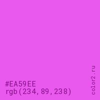 Цвет #EA59EE в цветовой модели RGB обозначается тремя октетами (234, 89, 238) в десятичном формате и #EA59EE в шестнадцатиричном (hex) формате, которые являются интенсивностью красного 234 (hex EA), интенсивность зелёного 89 (hex 59) и интенсивность синего 238 (hex EE).
