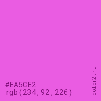 Цвет #EA5CE2 в цветовой модели RGB обозначается тремя октетами (234, 92, 226) в десятичном формате и #EA5CE2 в шестнадцатиричном (hex) формате, которые являются интенсивностью красного 234 (hex EA), интенсивность зелёного 92 (hex 5C) и интенсивность синего 226 (hex E2).