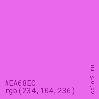 Цвет #EA68EC в цветовой модели RGB обозначается тремя октетами (234, 104, 236) в десятичном формате и #EA68EC в шестнадцатиричном (hex) формате, которые являются интенсивностью красного 234 (hex EA), интенсивность зелёного 104 (hex 68) и интенсивность синего 236 (hex EC).