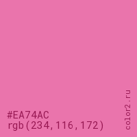 Цвет #EA74AC в цветовой модели RGB обозначается тремя октетами (234, 116, 172) в десятичном формате и #EA74AC в шестнадцатиричном (hex) формате, которые являются интенсивностью красного 234 (hex EA), интенсивность зелёного 116 (hex 74) и интенсивность синего 172 (hex AC).