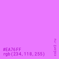 Цвет #EA76FF в цветовой модели RGB обозначается тремя октетами (234, 118, 255) в десятичном формате и #EA76FF в шестнадцатиричном (hex) формате, которые являются интенсивностью красного 234 (hex EA), интенсивность зелёного 118 (hex 76) и интенсивность синего 255 (hex FF).