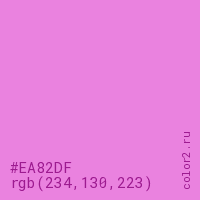 Цвет #EA82DF в цветовой модели RGB обозначается тремя октетами (234, 130, 223) в десятичном формате и #EA82DF в шестнадцатиричном (hex) формате, которые являются интенсивностью красного 234 (hex EA), интенсивность зелёного 130 (hex 82) и интенсивность синего 223 (hex DF).