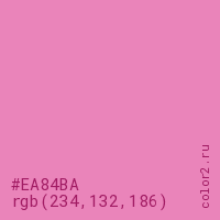 Цвет #EA84BA в цветовой модели RGB обозначается тремя октетами (234, 132, 186) в десятичном формате и #EA84BA в шестнадцатиричном (hex) формате, которые являются интенсивностью красного 234 (hex EA), интенсивность зелёного 132 (hex 84) и интенсивность синего 186 (hex BA).