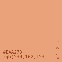 Цвет #EAA27B в цветовой модели RGB обозначается тремя октетами (234, 162, 123) в десятичном формате и #EAA27B в шестнадцатиричном (hex) формате, которые являются интенсивностью красного 234 (hex EA), интенсивность зелёного 162 (hex A2) и интенсивность синего 123 (hex 7B).