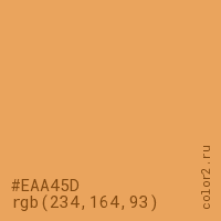Цвет #EAA45D в цветовой модели RGB обозначается тремя октетами (234, 164, 93) в десятичном формате и #EAA45D в шестнадцатиричном (hex) формате, которые являются интенсивностью красного 234 (hex EA), интенсивность зелёного 164 (hex A4) и интенсивность синего 93 (hex 5D).
