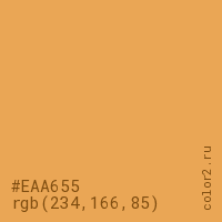 Цвет #EAA655 в цветовой модели RGB обозначается тремя октетами (234, 166, 85) в десятичном формате и #EAA655 в шестнадцатиричном (hex) формате, которые являются интенсивностью красного 234 (hex EA), интенсивность зелёного 166 (hex A6) и интенсивность синего 85 (hex 55).