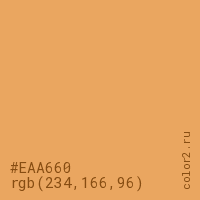 Цвет #EAA660 в цветовой модели RGB обозначается тремя октетами (234, 166, 96) в десятичном формате и #EAA660 в шестнадцатиричном (hex) формате, которые являются интенсивностью красного 234 (hex EA), интенсивность зелёного 166 (hex A6) и интенсивность синего 96 (hex 60).