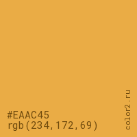 Цвет #EAAC45 в цветовой модели RGB обозначается тремя октетами (234, 172, 69) в десятичном формате и #EAAC45 в шестнадцатиричном (hex) формате, которые являются интенсивностью красного 234 (hex EA), интенсивность зелёного 172 (hex AC) и интенсивность синего 69 (hex 45).