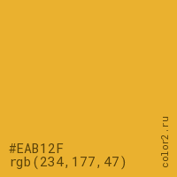 Цвет #EAB12F в цветовой модели RGB обозначается тремя октетами (234, 177, 47) в десятичном формате и #EAB12F в шестнадцатиричном (hex) формате, которые являются интенсивностью красного 234 (hex EA), интенсивность зелёного 177 (hex B1) и интенсивность синего 47 (hex 2F).