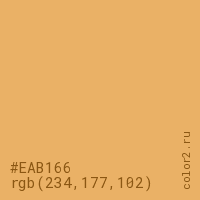 Цвет #EAB166 в цветовой модели RGB обозначается тремя октетами (234, 177, 102) в десятичном формате и #EAB166 в шестнадцатиричном (hex) формате, которые являются интенсивностью красного 234 (hex EA), интенсивность зелёного 177 (hex B1) и интенсивность синего 102 (hex 66).