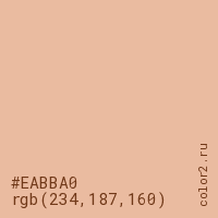 Цвет #EABBA0 в цветовой модели RGB обозначается тремя октетами (234, 187, 160) в десятичном формате и #EABBA0 в шестнадцатиричном (hex) формате, которые являются интенсивностью красного 234 (hex EA), интенсивность зелёного 187 (hex BB) и интенсивность синего 160 (hex A0).
