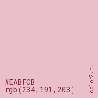 Цвет #EABFCB в цветовой модели RGB обозначается тремя октетами (234, 191, 203) в десятичном формате и #EABFCB в шестнадцатиричном (hex) формате, которые являются интенсивностью красного 234 (hex EA), интенсивность зелёного 191 (hex BF) и интенсивность синего 203 (hex CB).