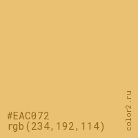 Цвет #EAC072 в цветовой модели RGB обозначается тремя октетами (234, 192, 114) в десятичном формате и #EAC072 в шестнадцатиричном (hex) формате, которые являются интенсивностью красного 234 (hex EA), интенсивность зелёного 192 (hex C0) и интенсивность синего 114 (hex 72).