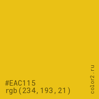 Цвет #EAC115 в цветовой модели RGB обозначается тремя октетами (234, 193, 21) в десятичном формате и #EAC115 в шестнадцатиричном (hex) формате, которые являются интенсивностью красного 234 (hex EA), интенсивность зелёного 193 (hex C1) и интенсивность синего 21 (hex 15).