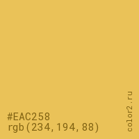 Цвет #EAC258 в цветовой модели RGB обозначается тремя октетами (234, 194, 88) в десятичном формате и #EAC258 в шестнадцатиричном (hex) формате, которые являются интенсивностью красного 234 (hex EA), интенсивность зелёного 194 (hex C2) и интенсивность синего 88 (hex 58).