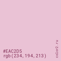Цвет #EAC2D5 в цветовой модели RGB обозначается тремя октетами (234, 194, 213) в десятичном формате и #EAC2D5 в шестнадцатиричном (hex) формате, которые являются интенсивностью красного 234 (hex EA), интенсивность зелёного 194 (hex C2) и интенсивность синего 213 (hex D5).