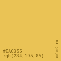 Цвет #EAC355 в цветовой модели RGB обозначается тремя октетами (234, 195, 85) в десятичном формате и #EAC355 в шестнадцатиричном (hex) формате, которые являются интенсивностью красного 234 (hex EA), интенсивность зелёного 195 (hex C3) и интенсивность синего 85 (hex 55).