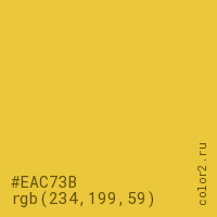 Цвет #EAC73B в цветовой модели RGB обозначается тремя октетами (234, 199, 59) в десятичном формате и #EAC73B в шестнадцатиричном (hex) формате, которые являются интенсивностью красного 234 (hex EA), интенсивность зелёного 199 (hex C7) и интенсивность синего 59 (hex 3B).