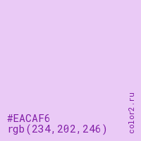 Цвет #EACAF6 в цветовой модели RGB обозначается тремя октетами (234, 202, 246) в десятичном формате и #EACAF6 в шестнадцатиричном (hex) формате, которые являются интенсивностью красного 234 (hex EA), интенсивность зелёного 202 (hex CA) и интенсивность синего 246 (hex F6).