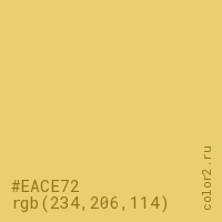 Цвет #EACE72 в цветовой модели RGB обозначается тремя октетами (234, 206, 114) в десятичном формате и #EACE72 в шестнадцатиричном (hex) формате, которые являются интенсивностью красного 234 (hex EA), интенсивность зелёного 206 (hex CE) и интенсивность синего 114 (hex 72).