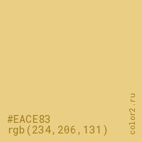 Цвет #EACE83 в цветовой модели RGB обозначается тремя октетами (234, 206, 131) в десятичном формате и #EACE83 в шестнадцатиричном (hex) формате, которые являются интенсивностью красного 234 (hex EA), интенсивность зелёного 206 (hex CE) и интенсивность синего 131 (hex 83).