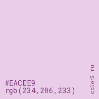 Цвет #EACEE9 в цветовой модели RGB обозначается тремя октетами (234, 206, 233) в десятичном формате и #EACEE9 в шестнадцатиричном (hex) формате, которые являются интенсивностью красного 234 (hex EA), интенсивность зелёного 206 (hex CE) и интенсивность синего 233 (hex E9).