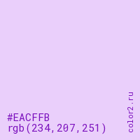 Цвет #EACFFB в цветовой модели RGB обозначается тремя октетами (234, 207, 251) в десятичном формате и #EACFFB в шестнадцатиричном (hex) формате, которые являются интенсивностью красного 234 (hex EA), интенсивность зелёного 207 (hex CF) и интенсивность синего 251 (hex FB).